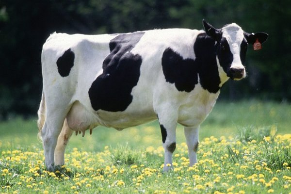 Holsteins have distinctive markings, usually black and white or red and white in colour, typically exhibiting piebald patterns. On rare occasions, some have both black and red colouring with white. Red factor causes this unique colouring. ‘Blue’ is also a known colour. This colour is produced by white hairs mixed with the black hairs giving the cow a bluish tint. This colouring is also known as ‘blue roan’ in some farm circles. They are famed for their high dairy production, averaging 22,530 pounds (10,220 kg) of milk per year. Of this milk, 858 pounds (3.7%) are butterfat and 719 pounds (3.1%) are protein.